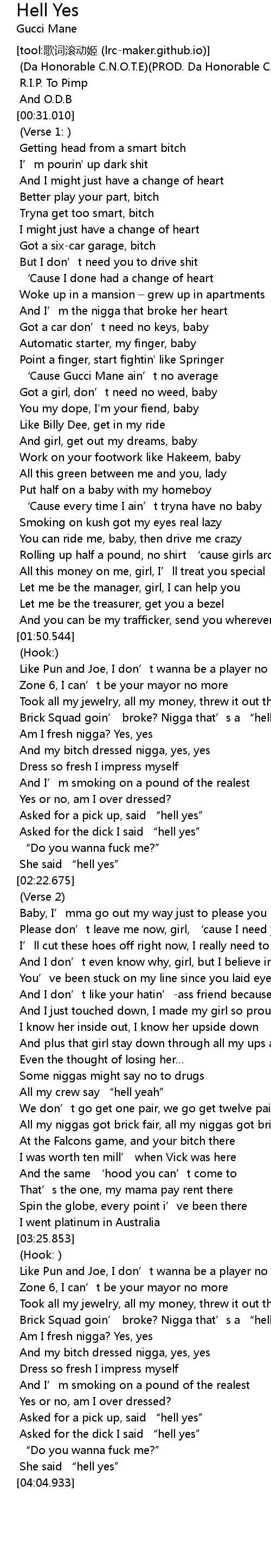 | [02:03.464] | Brick Squad goin’ broke? Nigga that’s a “hell no” |