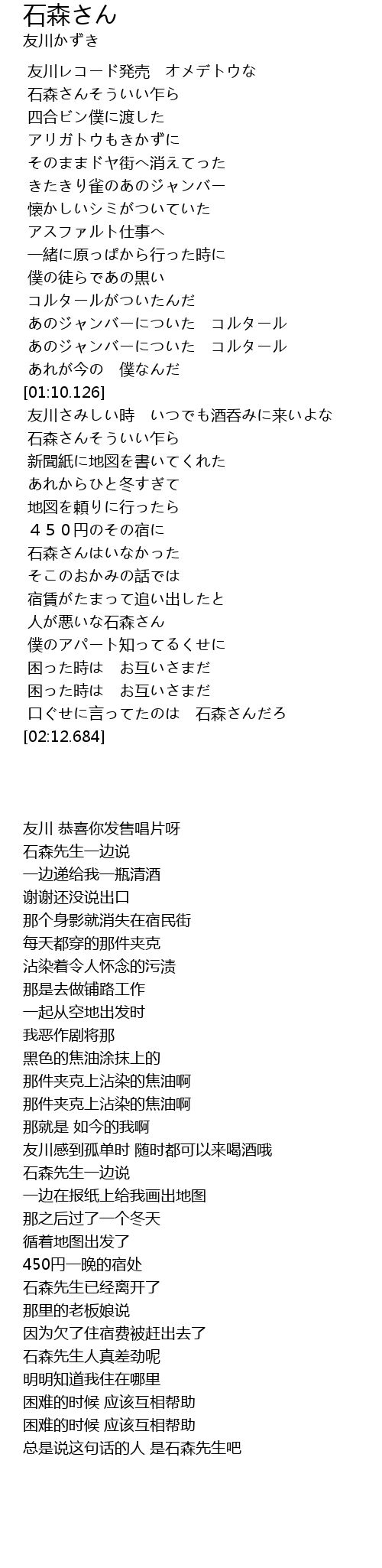 | [02:07.850] | 口ぐせに言ってたのは 石森さんだろ |