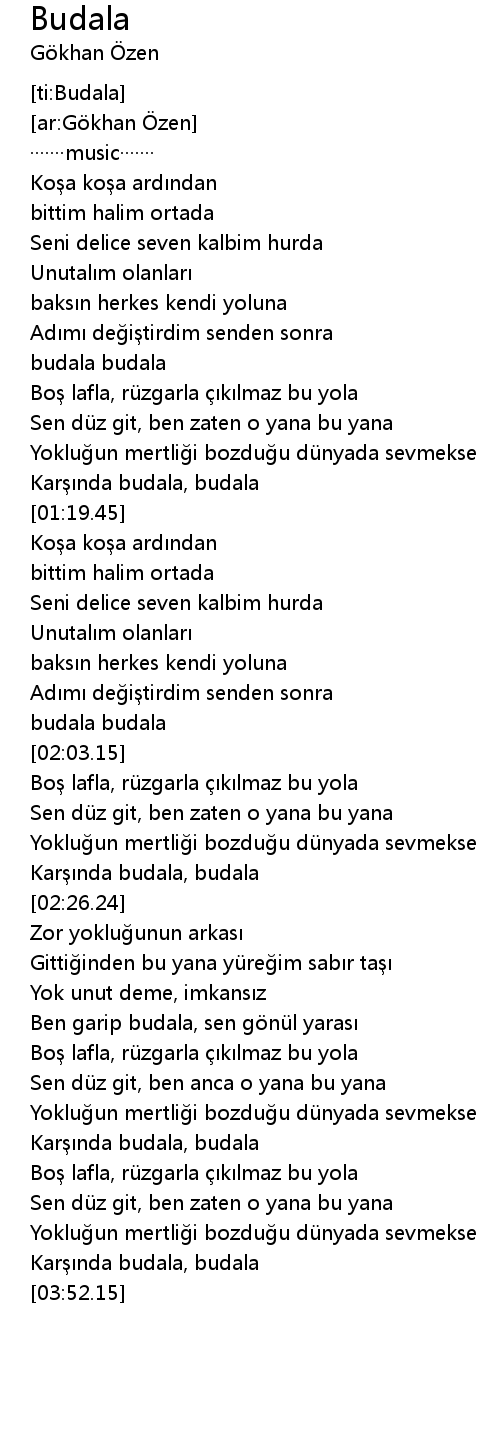 | [02:04.79] | Bo lafla, rü zgarla k lmaz bu yola |