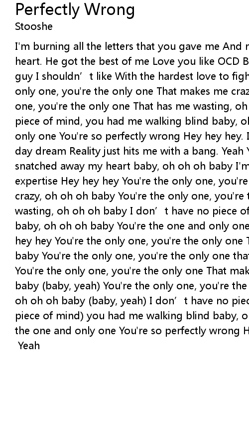 | I' m burning all the letters that you gave me And ripping every picture out my heart. He got the best of me Love you like OCD Baby, oh oh oh baby You' re the guy I shouldn' t like With the hardest love to fight Hey hey hey You' re the only one, you' re the only one That makes me crazy, oh oh oh baby You' re the only one, you' re the only one That has me wasting, oh oh oh baby I don' t have no piece of mind, you had me walking blind baby, oh oh oh baby You' re the one and only one You' re so perfectly wrong Hey hey hey. I' m waking everyday it' s such a day dream Reality just hits me with a bang. Yeah You shot my soul apart Then snatched away my heart baby, oh oh oh baby I' m dying on my knees, from all your expertise Hey hey hey You' re the only one, you' re the only one That makes me crazy, oh oh oh baby You' re the only one, you' re the only one That has me wasting, oh oh oh baby I don' t have no piece of mind, you had me walking blind baby, oh oh oh baby You' re the one and only one You' re so perfectly wrong Hey hey hey You' re the only one, you' re the only one That makes me crazy, oh oh oh baby You' re the only one, you' re the only one that has me wasting, oh oh oh baby You' re the only one, you' re the only one That makes me crazy crazy, oh oh oh baby baby, yeah You' re the only one, you' re the only one That has me wasting, oh oh oh baby baby, yeah I don' t have no piece of mind, I don' t have no piece of mind you had me walking blind baby, oh oh oh baby baby, yeah You' re the one and only one You' re so perfectly wrong Hey hey hey. You' re the only one, Oh oh oh baby x3 Yeah |