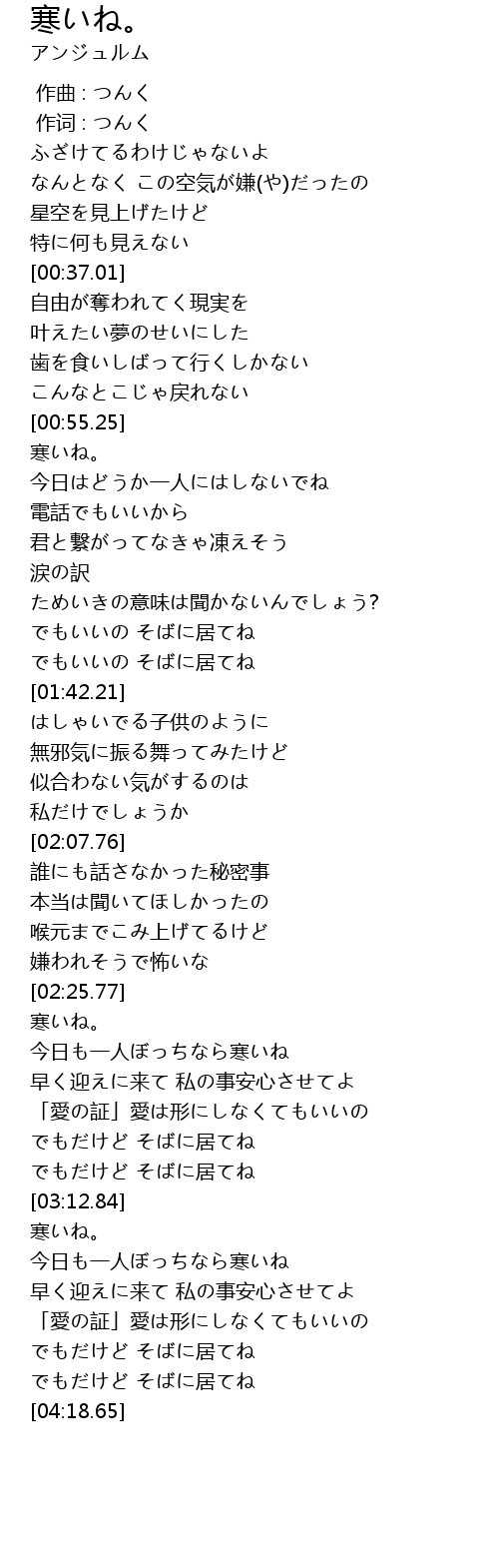| [03:36.94] | 今日も一人ぼっちなら寒いね |