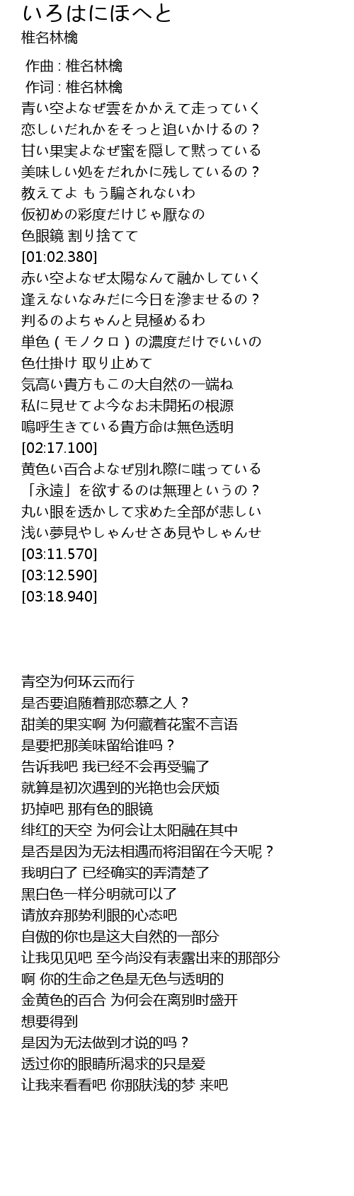 | [02:02.770] | 嗚呼生きている貴方命は無色透明 |