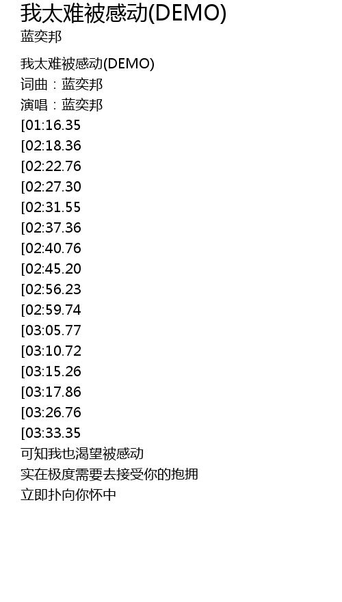 | [00:25.22][01:16.35][02:01.74][02:51.88][04:02.09] | 蓝奕邦-我太难被感动(DEMO) |