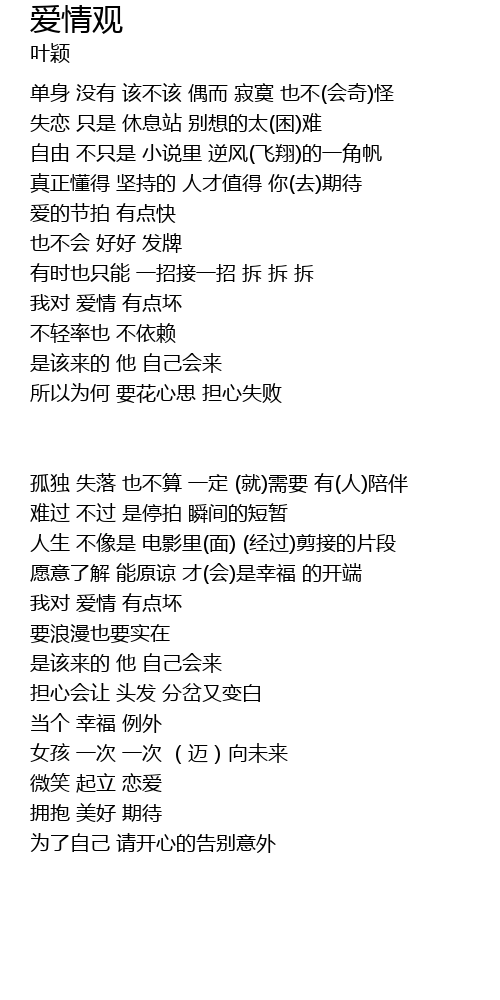 | 单身 没有 该不该 偶而 寂寞 也不(会奇)怪 | |