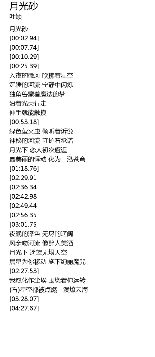| [03:58.62][02:49.44][01:38.62] | 月光下精灵牵着手 歌颂恋人们的梦 |