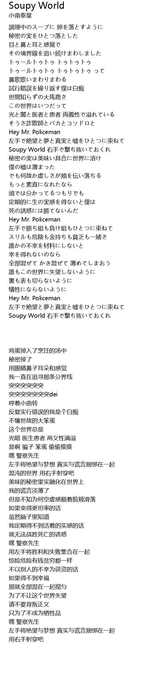 | [03:06.895] | Soupy World 右手で撃ち抜いておくれ |