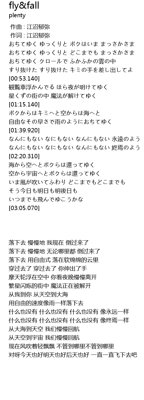 | [00:10.710] | おちてゆく ゆっくりと どこまでも まっさかさま |