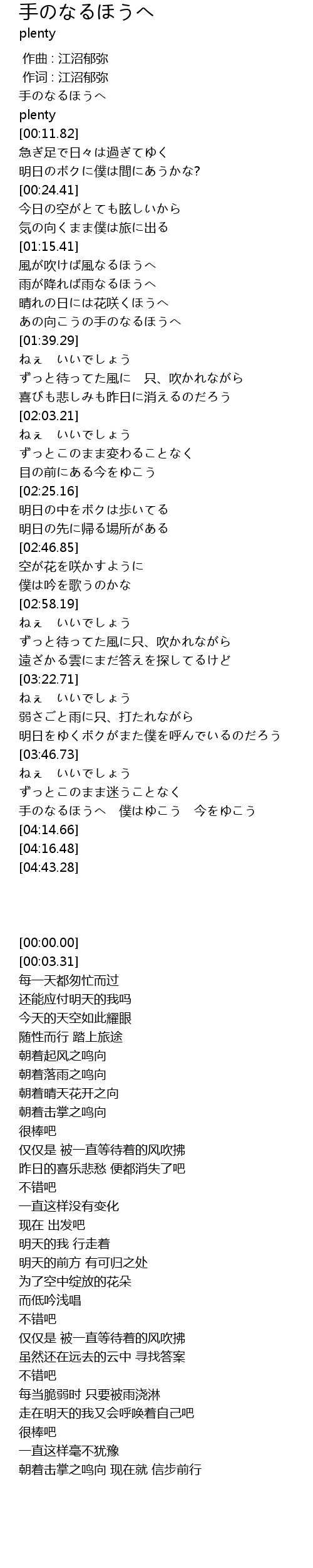 | [01:33.69] | あの向こうの手のなるほうへ |