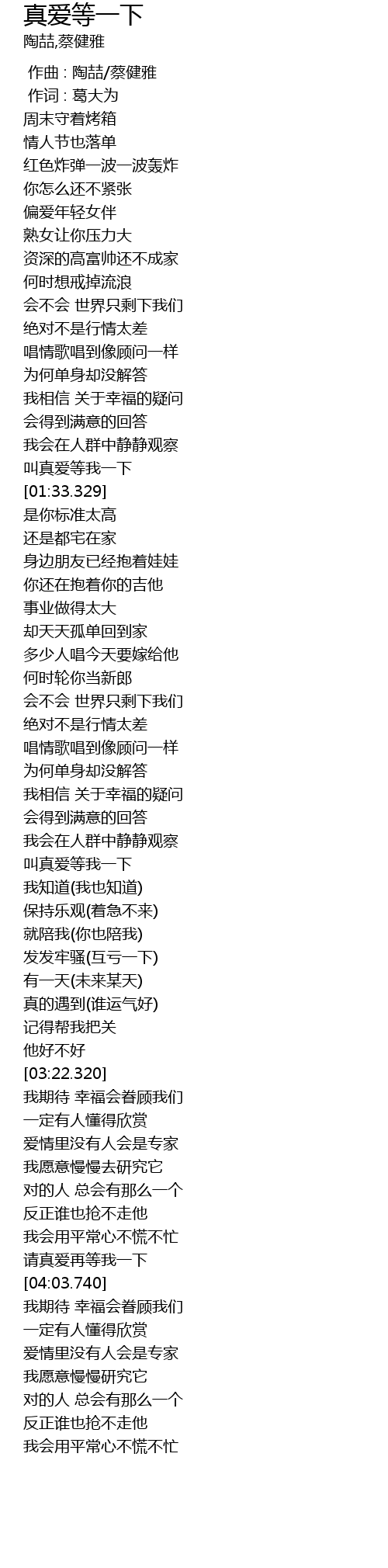 | [02:58.570] | jiào zhēn ài děng wǒ yī xià |