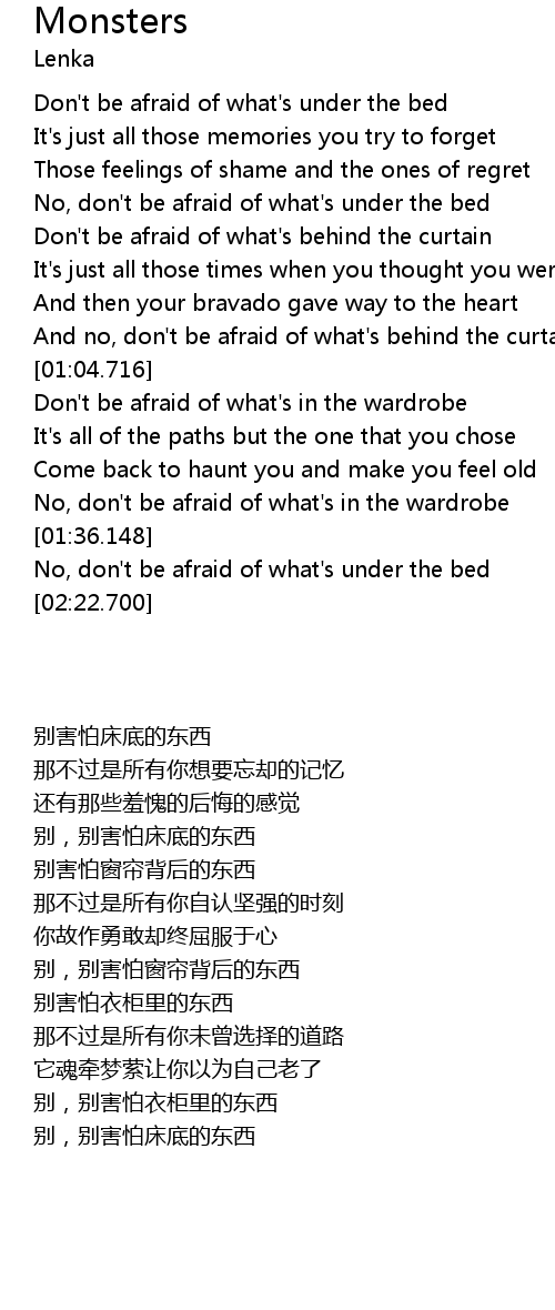 | [00:09.360] | Don't be afraid of what's under the bed |