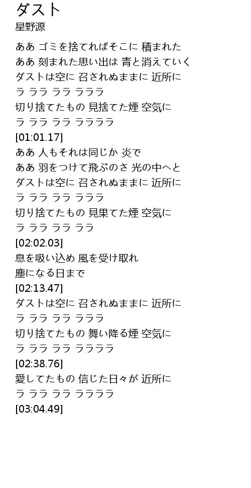 | [01:37.66] | ダストは空に 召されぬままに 近所に |