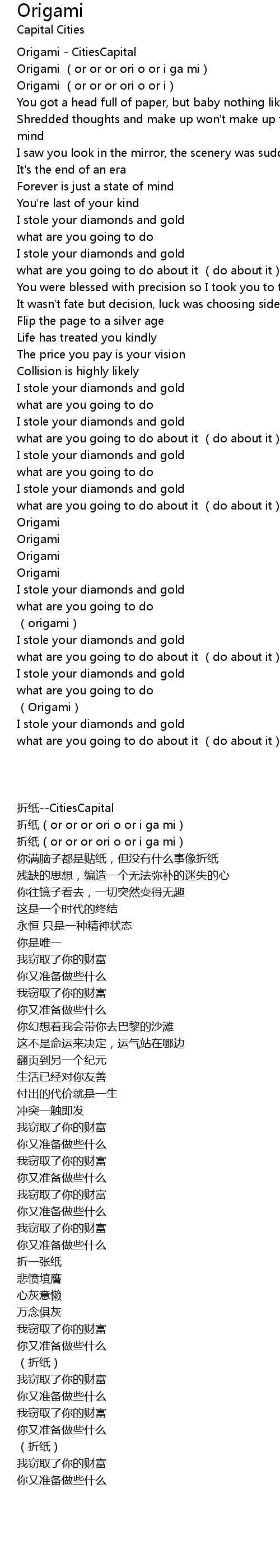 | [00:08.62] | Origami (or or or ori o or i ga mi) |