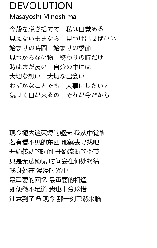 | [00:29.57] | 今殻を脱ぎ捨てて 私は目覚める |