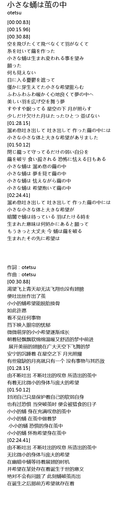 | [02:14.71] | 小さな蛹は 怯えながら繭の中 |