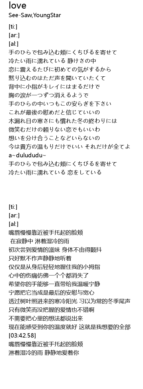 | [04:16.54] | 冷たい雨に濡れている 恋をしている |