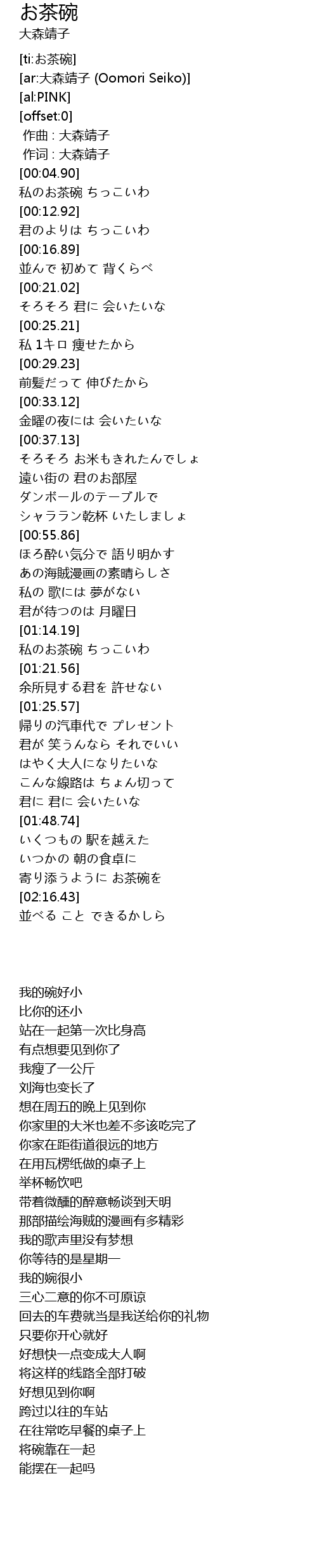 | [00:09.63] | 私のお茶碗 ちっこいわ |