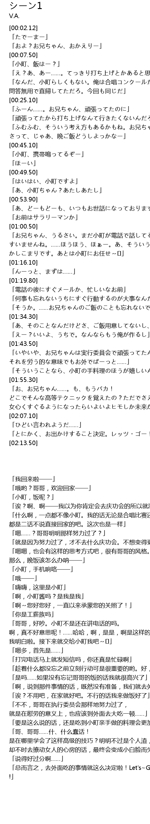 | [00:40.20] | さって、じゃあ、晩ご飯どうしよっかなー」 |