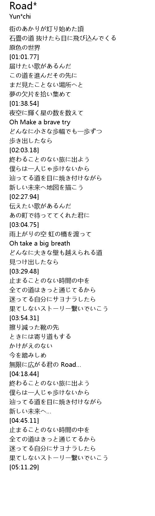 | [04:12.31] | 無限に広がる君の Road… |