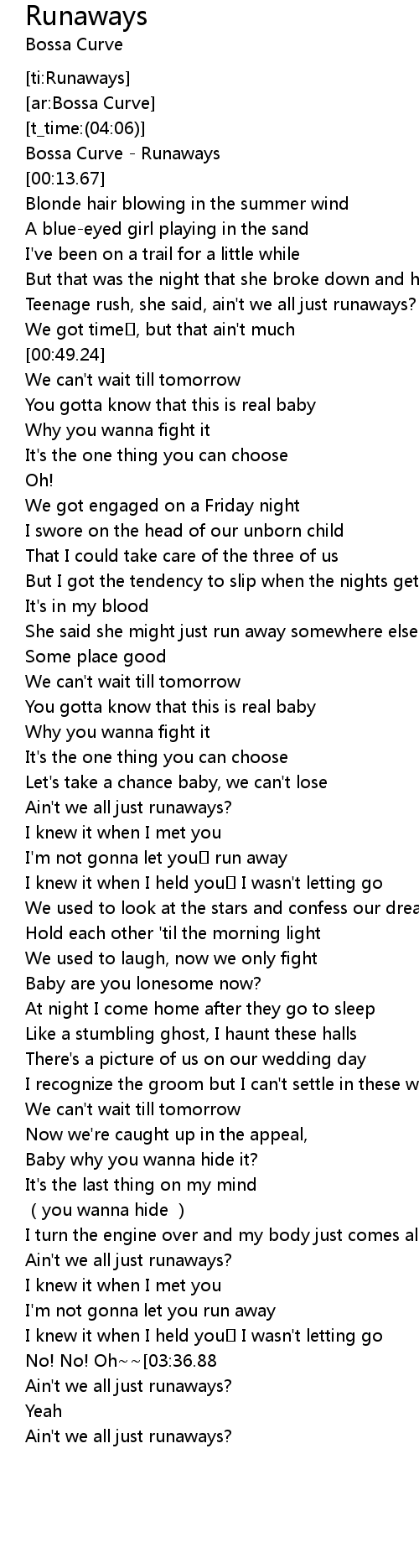 | [00:41.00] | Teenage rush, she said, ain' t we all just runaways? |