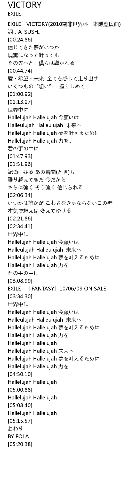 | [00:00.00] | EXILE - VICTORY(2010南非世界杯日本隊應援曲) |