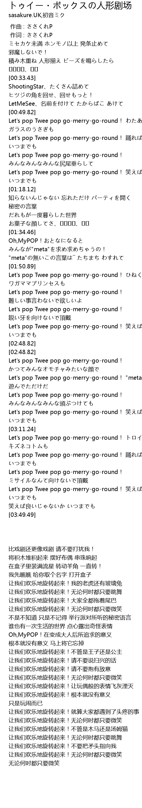 | [03:00.13] | Let' s pop Twee pop gomerrygoround! tóu |