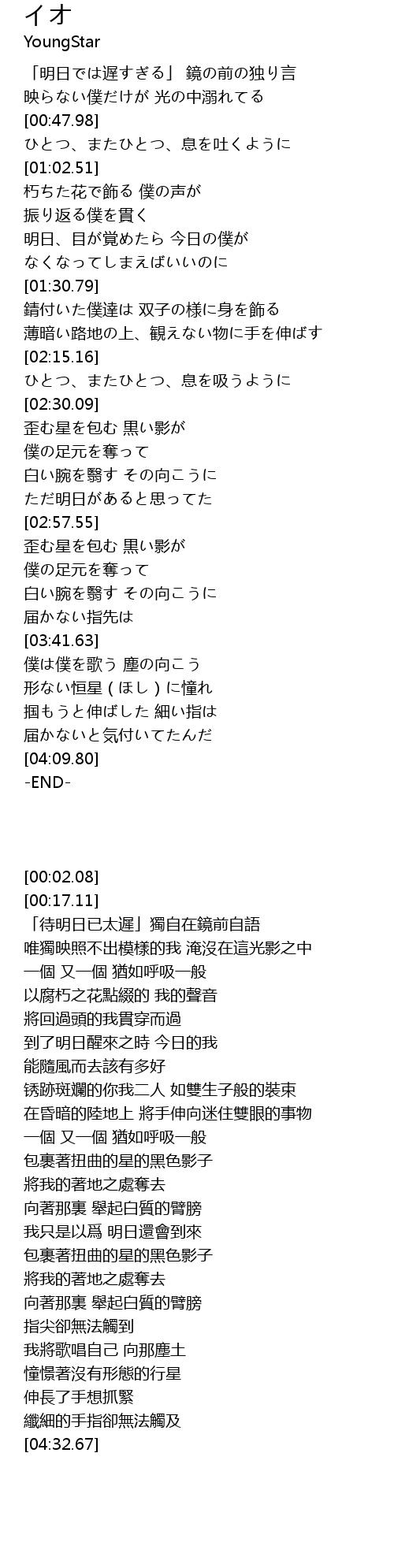 | [00:23.89] | 「明日では遅すぎる」 鏡の前の独り言 |