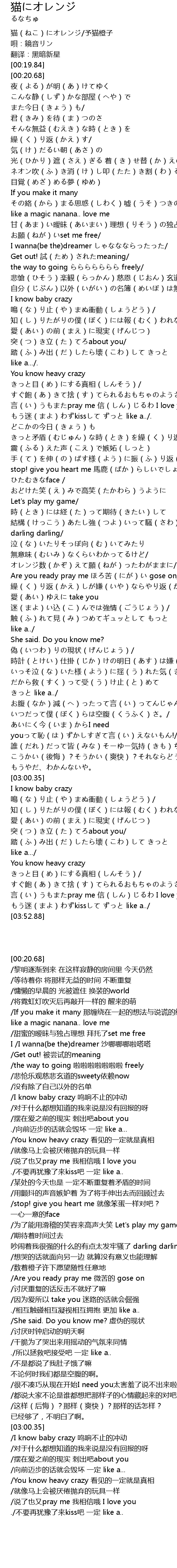 | [00:01.35] | 猫(ねこ)にオレンジ/予猫橙子 |