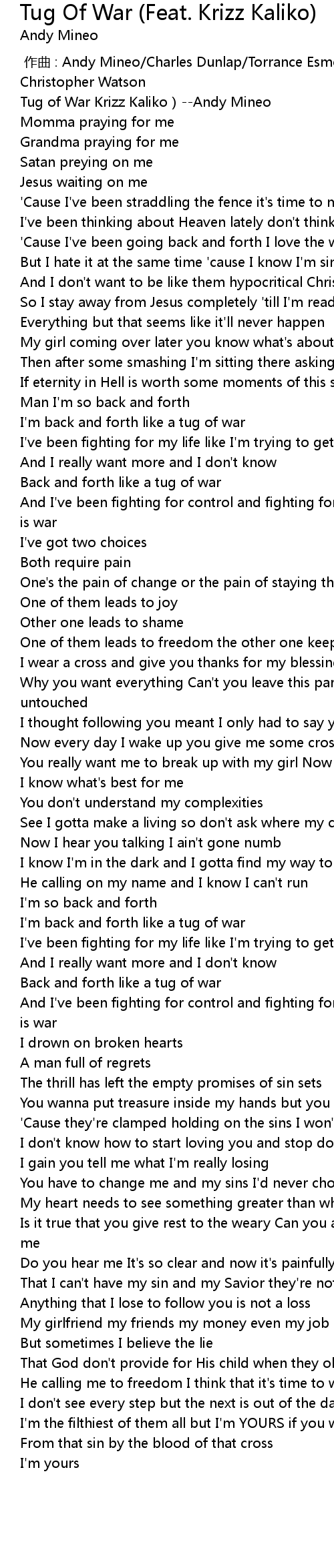| [00:01.10] | Tug of War Krizz Kaliko Andy Mineo |