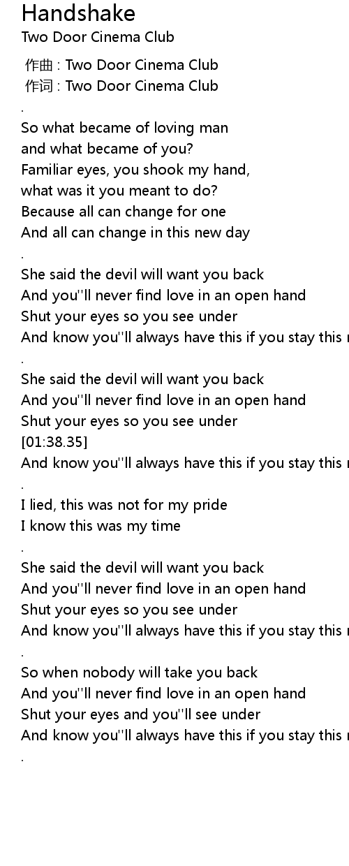 | [00:01.00] | 作词 : Two Door Cinema Club |