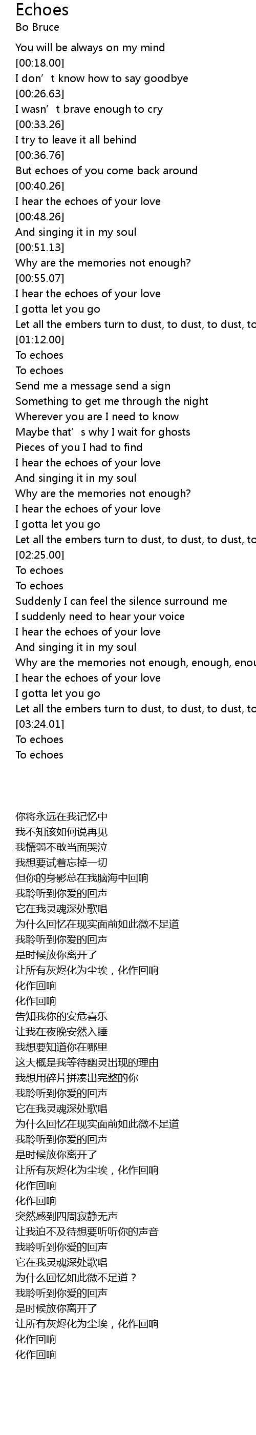 | [03:19.12] | Let all the embers turn to dust, to dust, to dust, to echoes |