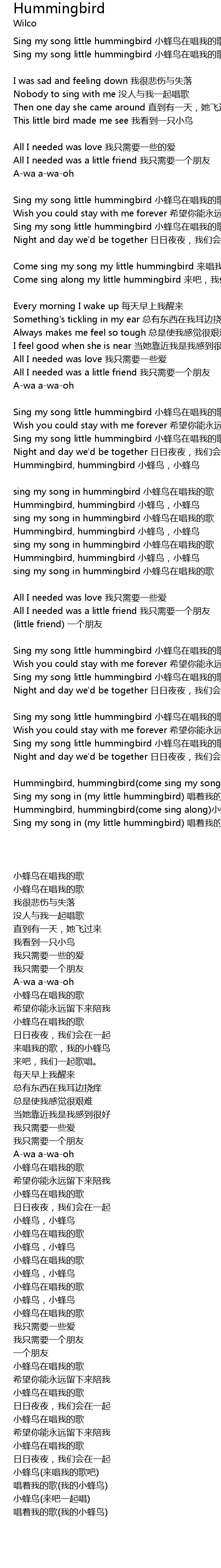 | Come sing along my little hummingbird lai ba, wo men yi qi ge chang. | |