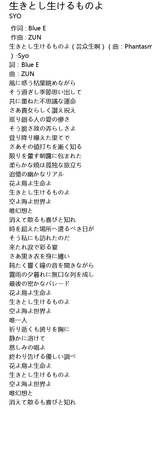 | [00:00.00] | 生きとし生けるものよ(芸众生啊)(曲:Phantasmagoria )-Syo |