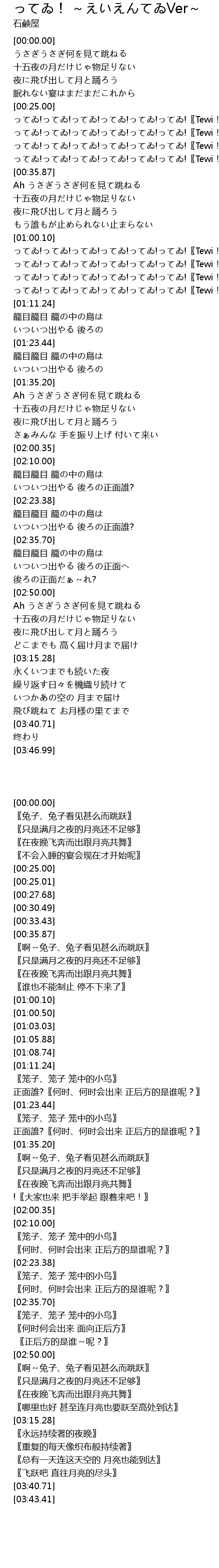 | [00:33.43] | ってゐ!ってゐ!ってゐ!ってゐ!ってゐ!ってゐ!〖Tewi!Tewi!Tewi!Tewi!Tewi!Tewi!〗 |