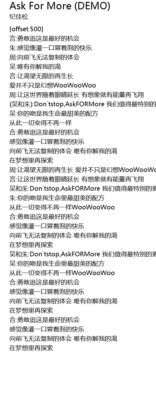 | [00:54.22] | (吴和朱):Don`tstop,AskFORMore 我们值得最特别的更好更多 |
