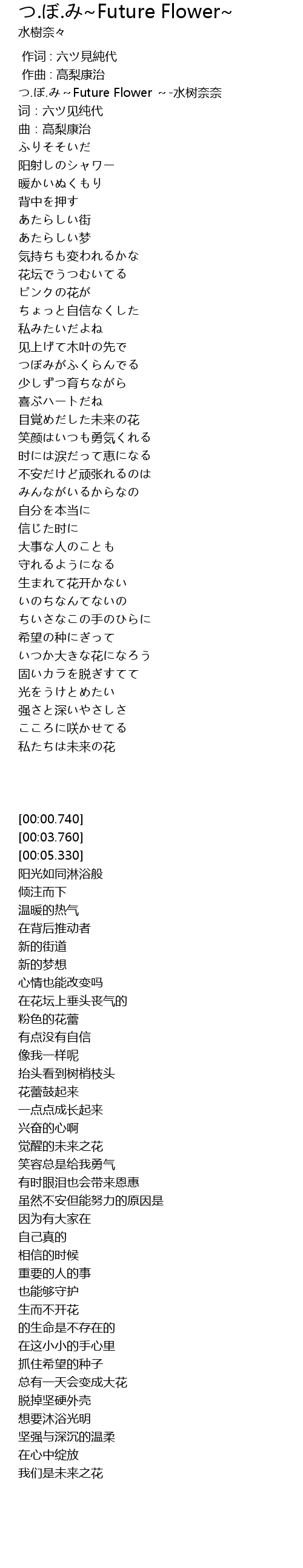 | [00:00.740] | .. Future Flower shuǐ shù nài nài |