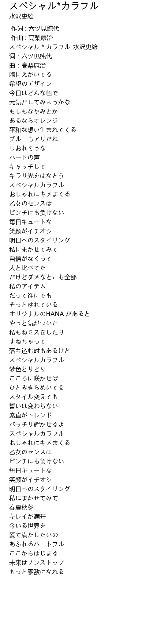 | [00:00.870] | スペシャル*カラフル-水沢史絵 |