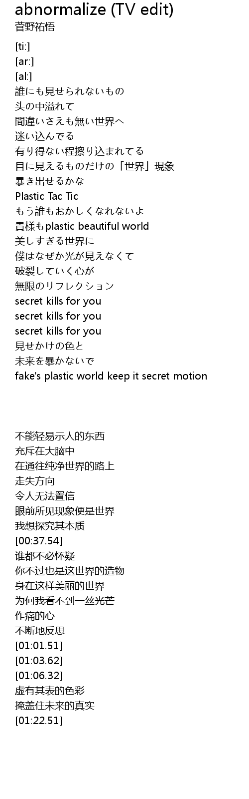 | [01:22.51] | fake's plastic world keep it secret motion |