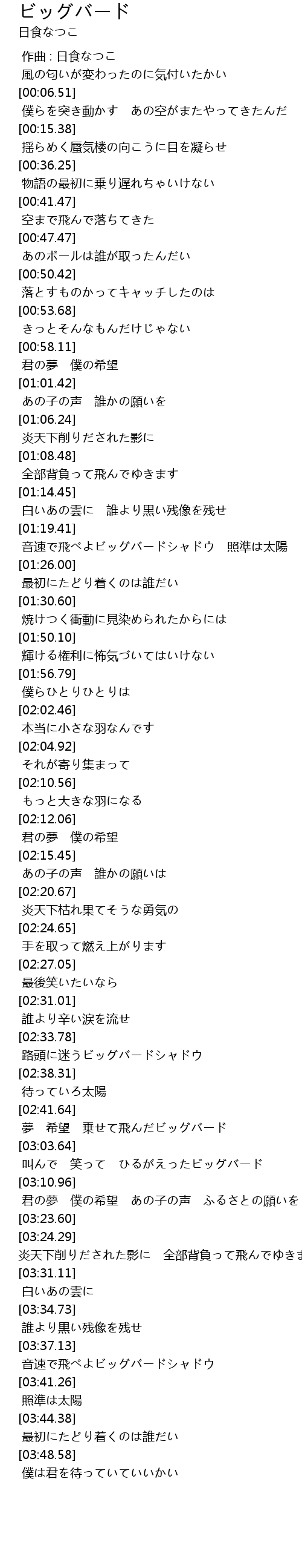 | [02:59.86] | 夢 希望 乗せて飛んだビッグバード |