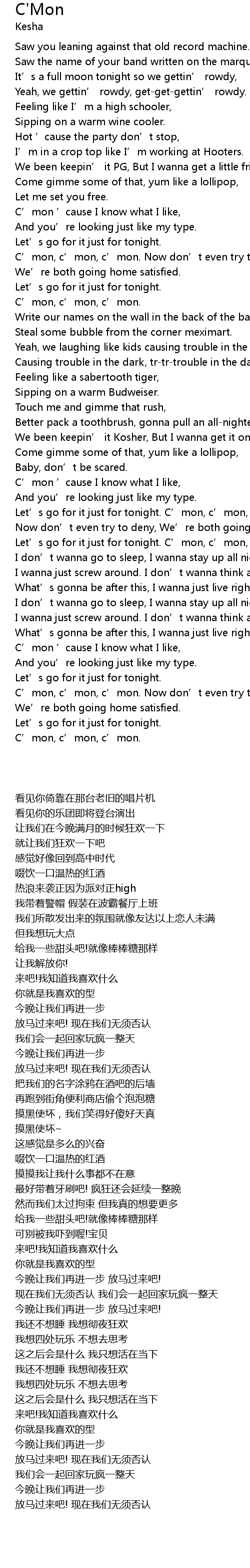 | [01:53.829] | Let' s go for it just for tonight. C' mon, c' mon, c' mon. |