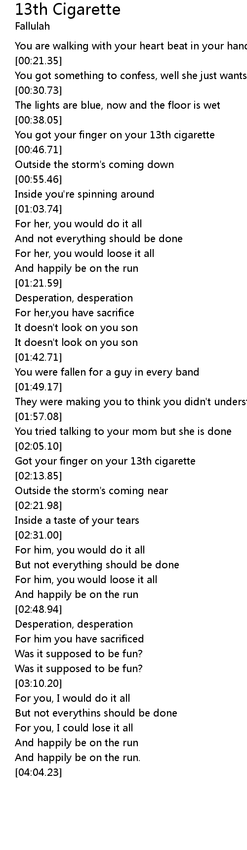 | [00:41.82] | You got your finger on your 13th cigarette |