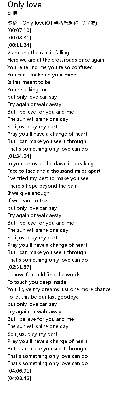 | [00:01.12] | 陈曦 - Only love(OT:当我想起你-张学友) |