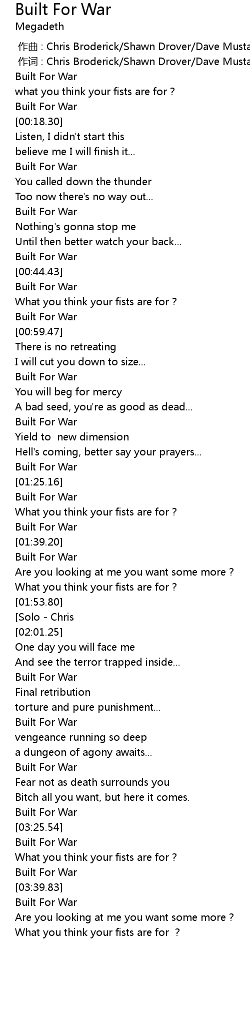 | [00:00.00] | zuò qǔ : Chris Broderick Shawn Drover Dave Mustaine |