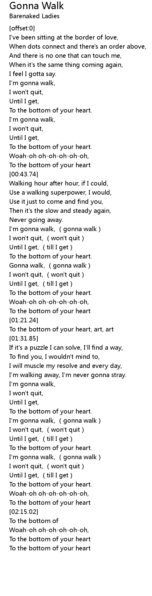 | [01:01.15] | I'm gonna walk, (gonna walk) |