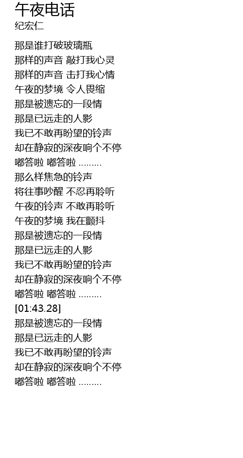 | [01:18.53] | 午夜的铃声 不敢再聆听 |