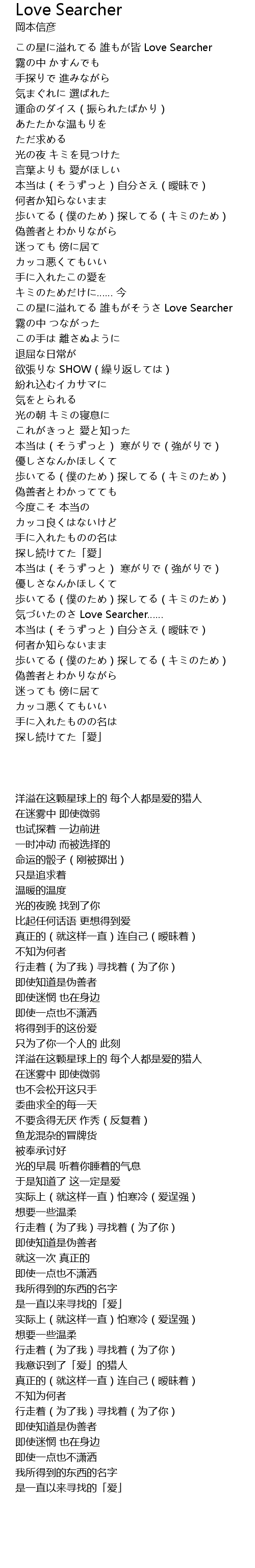 | [00:17.79] | この星に溢れてる 誰もが皆 Love Searcher |