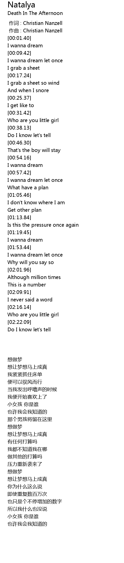 | [02:19.03] | Who are you little girl |
