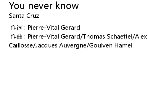| [00:00.000] | 作曲 : Pierre-Vital Gerard/Thomas Schaettel/Alex Tual/Vassili Caillosse/Jacques Auvergne/Goulven Hamel |
