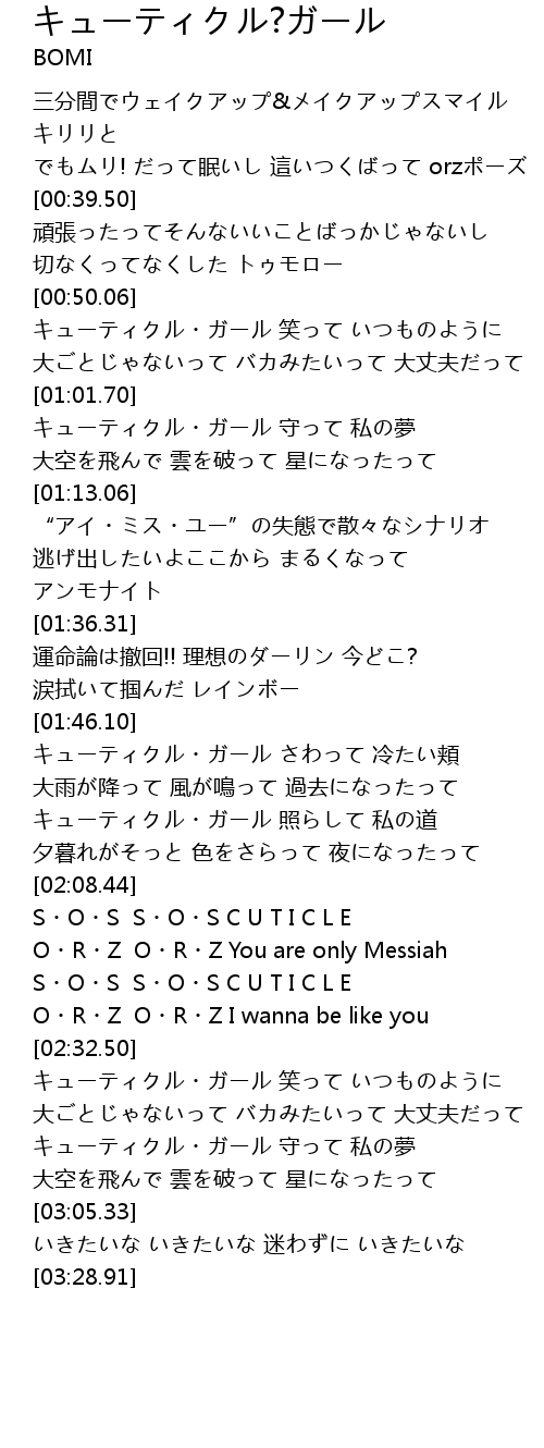 | [02:43.61] | キューティクル・ガール 笑って いつものように |