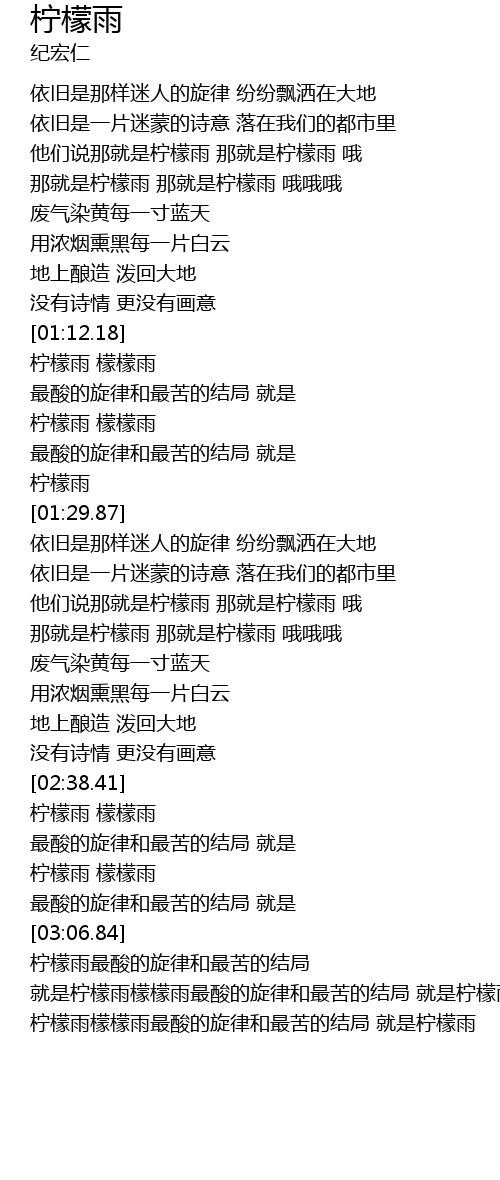 | [03:08.08] | 柠檬雨最酸的旋律和最苦的结局 就是柠檬雨檬檬雨最酸的旋律和最苦的结局 就是柠檬雨 柠檬雨檬檬雨最酸的旋律和最苦的结局 就是柠檬雨 |