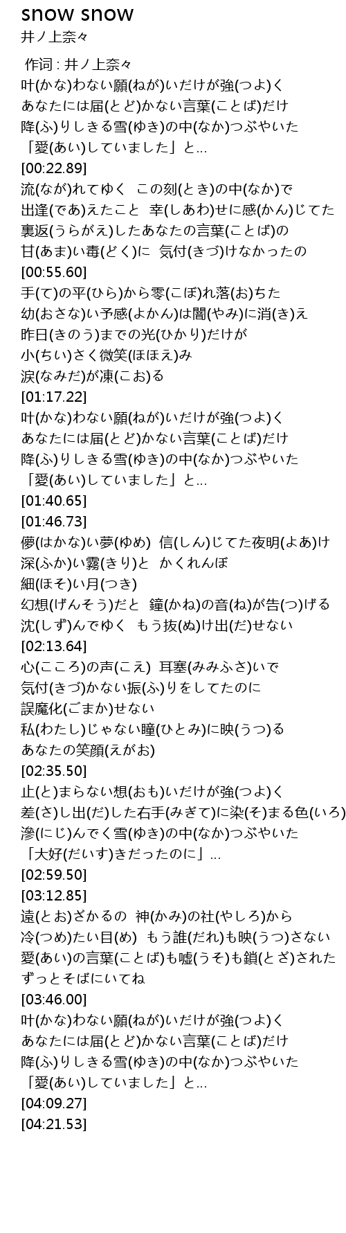 | [00:12.06] | 降(ふ)りしきる雪(ゆき)の中(なか)つぶやいた |